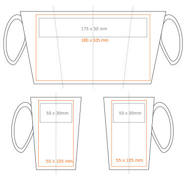 Impression sur le poignée (70x10 mm) Impression à l'intérieur (50x10 mm) Impression sur le fond à l'extérieur (ø35 mm) Impression d'or Impression d'argent Bord peint à la main Impression nominale |