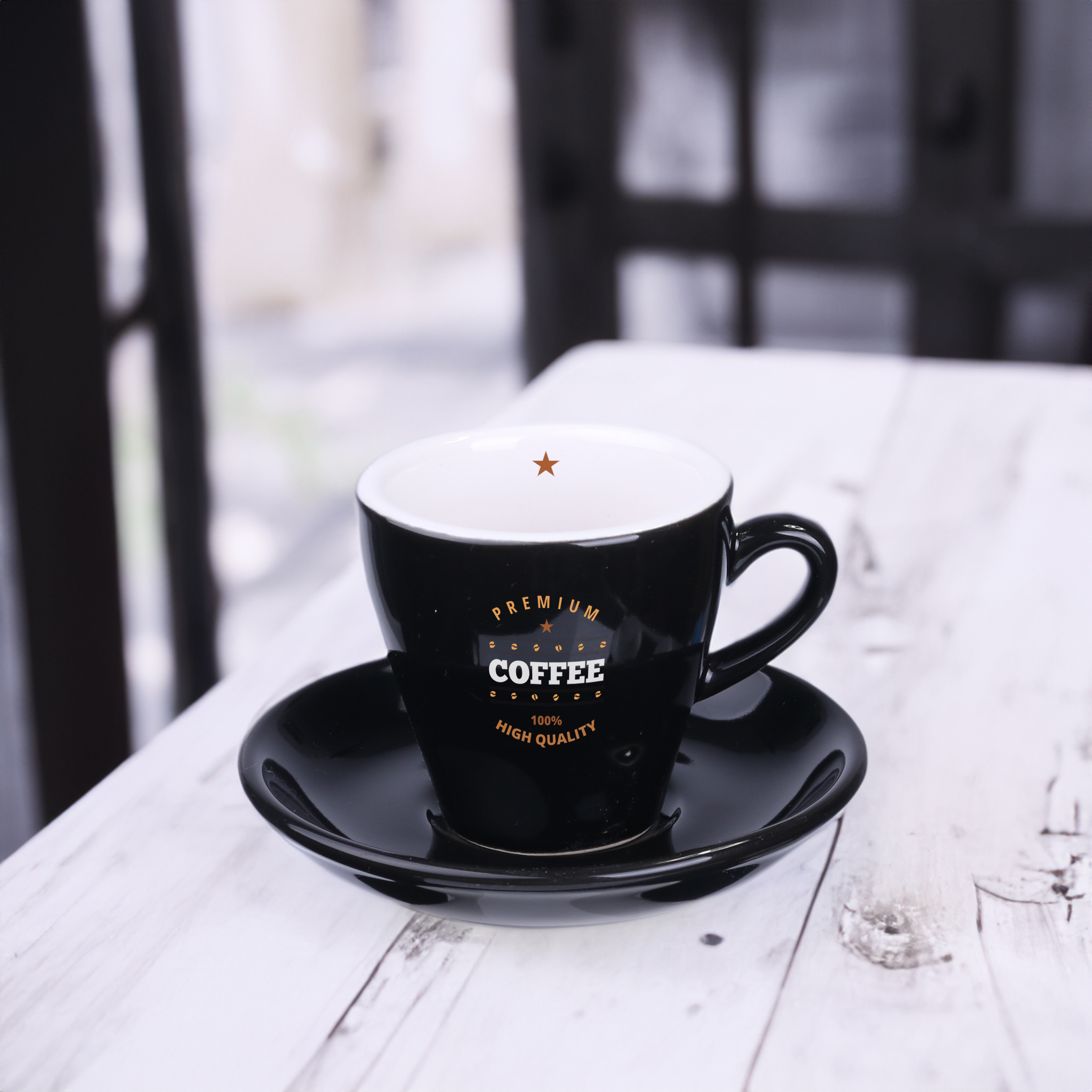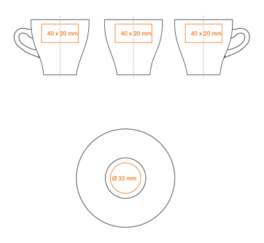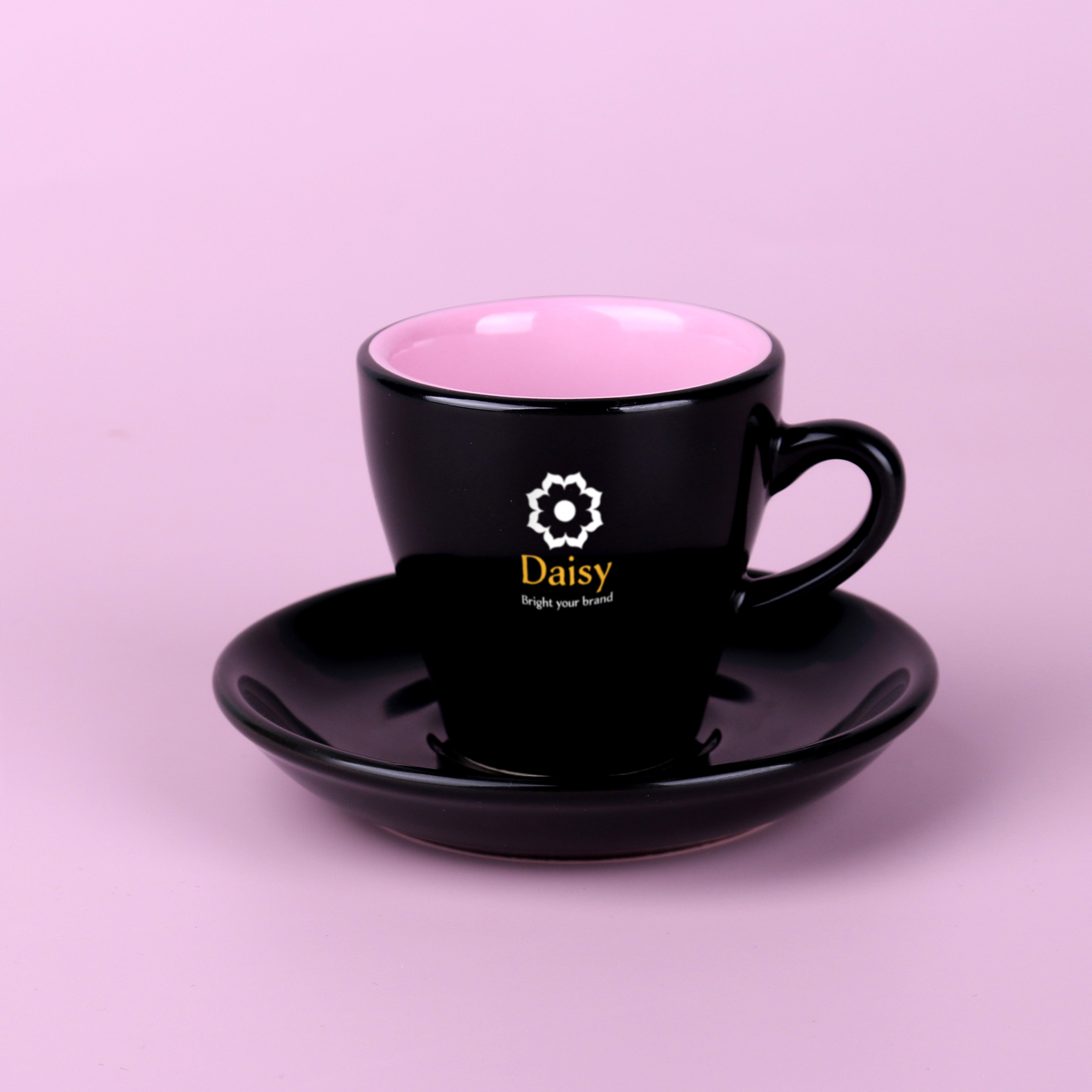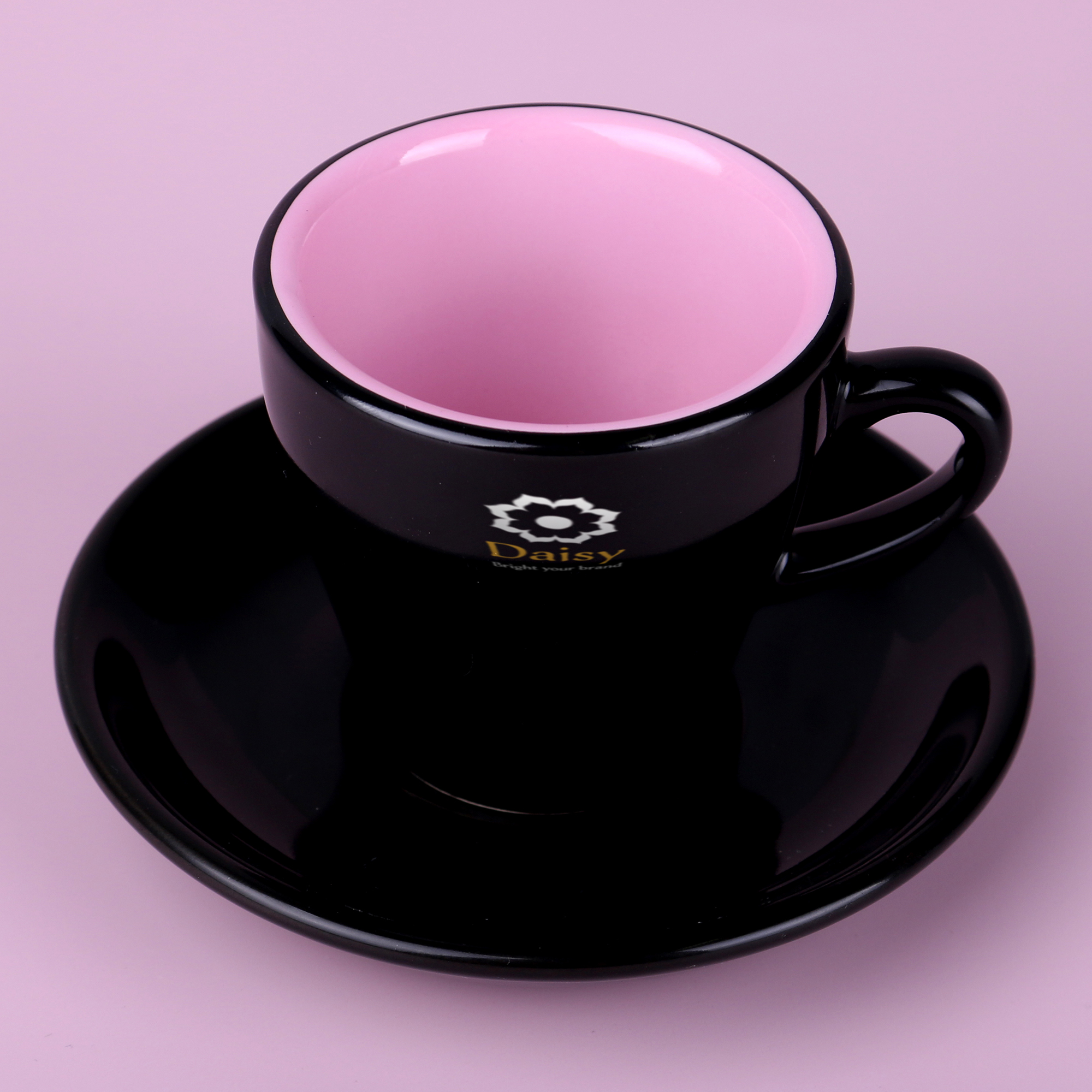 Ensemble Expresso, racé, comprenant une tasse et une sous-tasse dans un coloris noir brillant à l'extérieur et blanc à l'intérieur. Une image forte pour un expresso parfait. Un support stylé pour distinguer une marque